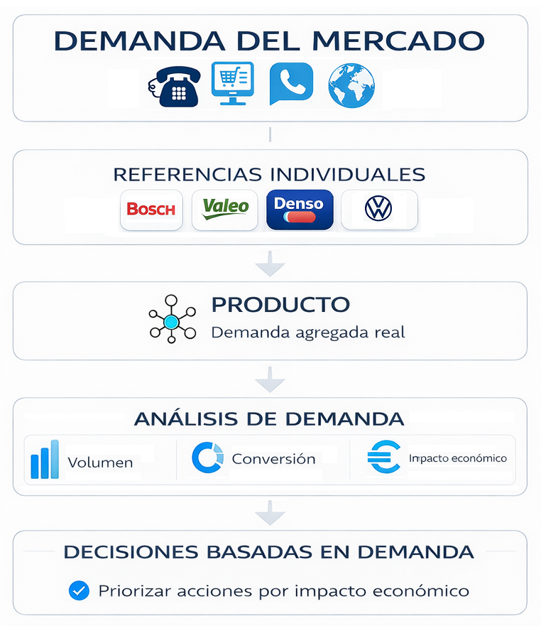 Una capa estructural basada en demanda real que transforma datos en decisiones, sin alterar tu operativa.